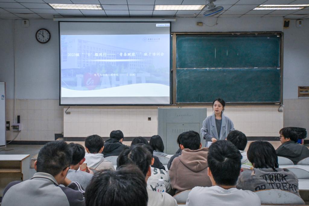 在秀山校区阶教203组织召开2023级“‘E’路同行——‘青春赋能’”班团骨干培训会第四期。本次培训聚焦“心理护航、学业协同、职业领航”三大主题,围绕大三学年关键节点开展专项赋能。2023级全体辅导员及各班班委参会,培训由张悦主持。
