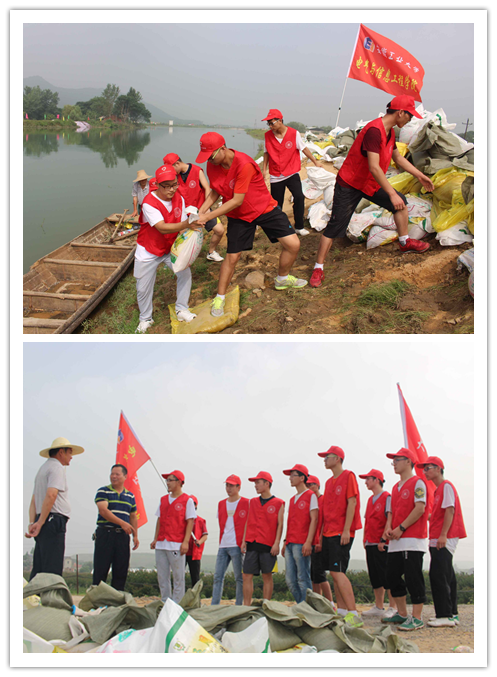 正在马鞍山市佳山乡学苑社区参加暑期社会实践的11名党员、入党积极分子志愿者在社区党支部的组织下,深入雨山区采石河超陂圩抗灾第一线,参与河堤防汛救灾。