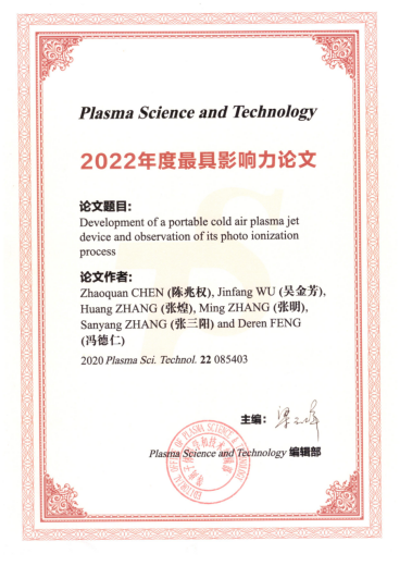 黄色仓库三名教师参加了会议,其中,陈兆权教授受邀作了题为“大微波瑞利散射测定等离子体射流的电子密度及其时空演化”的邀请报告,引起了与会专家和学者的热烈讨论与积极反响。陈思乐老师作了题为“大气压微波碳氟等离子体源研制”的口头报告。会议期间,与会教师们与等离子体物理学相关领域的专家们积极交流、深入探讨、受益匪浅。闭幕式上,《Plasma Science and Technolgy》期刊颁发了“2022年度最具影响力论文”奖,陈兆权教授的论文“Development of a portable cold air plasma jet device and observation of its photo ionization process”荣获此奖项。