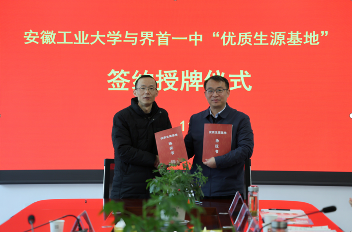 在安徽省示范高中的界首一中,播放学校建校65周年宣传片,全景式地向界首一中校领导、高三年级班主任们展示了我校在党建、学科与平台建设、师资队伍、学生培养、科技创新取得的成效,通报了界首一中的学子在我校各类获奖和考研升学就业等学业和职业发展情况。界首一中的校长闫峰和副校长李庆有等介绍了该校始终坚定贯彻党的教育方针,坚持以生为本,坚持德育为先,坚持文化育人,努力造就高素质的中学生。在2023年度高考中,有4名考生进入全省前20名,不断响应人民对优质教育的需求。优质生源基地签约仪式在界首市教育局局长魏灿、学校领导班子及高三班主任们的见证下,取得良好的成效。此次招生宣传对接会,双方还就优质生源地建设后续工作的高校夏令营、专家科普讲座、优秀人才成长信息共享等工作进行交流与探讨。