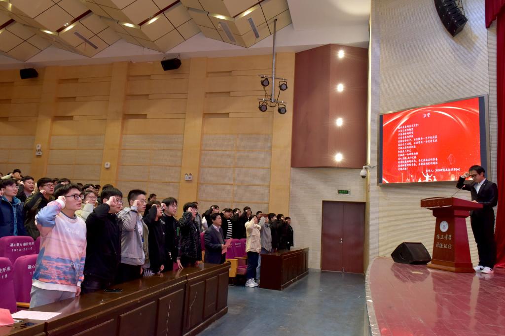2020级自动化专业1班金轩豪同学带领2024届全体考研学生进行集体宣誓。全体起立,高举右拳,同学们郑重宣誓,铿锵有力的宣誓声响彻会场。