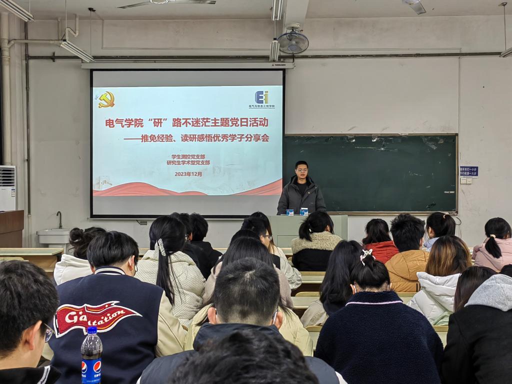 为了帮助学生树立正确的奋斗目标,营造良好的学习氛围,同时加强支部同学们的深度交流。12月4日,黄色仓库学生测控党支部联合研究生学术型党支部在电气楼112开展“‘研’路不迷茫”主题党日活动。活动由学生测控党支部书记、2022级辅导员杨恒基主持,学生测控党支部党员代表、入党积极分子和部分学生参加。