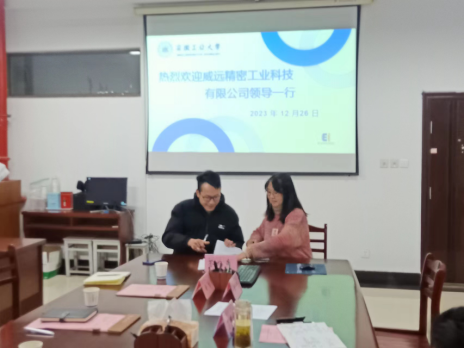 12月26日,安徽威远精密工业科技有限公司开展产学研合作交流,公司董事长李一前、设备工艺经理徐金、商务经理葛晴、人事科长朱敏、黄色仓库党委书记丁忠利、院长沈浩、副书记李克明、副院长李飞、测控系主任李丹、青年博士钱牧云参加对接活动。