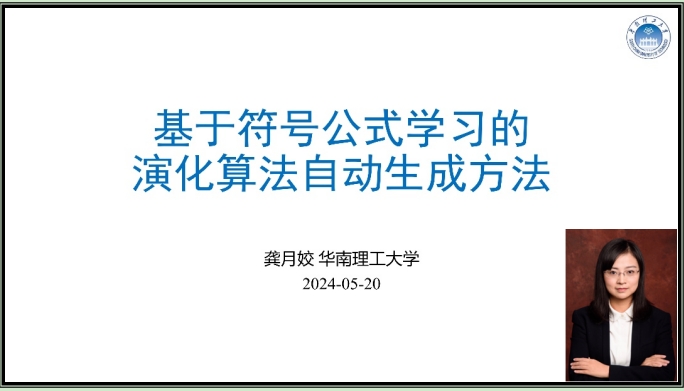 报告上,龚月姣详细介绍了一种基于符号表达学习的黑箱优化器自动生成新方法,该方法的核心思想是利用符号表达式树来生成黑箱优化器的更新规则,来实现算法的自动生成。该研究的创新之处在于:与传统黑箱优化器相比,采用该方法能够自动生成算法,无需依赖专家经验,具有更强的灵活性和更好的自适应性,而且生成的符号表达式更容易解释,可以更好地揭示优化过程的内在机理。同时,符号表达树的结构更容易进行扩展,进而应用于更复杂的优化任务。龚月娇还介绍了符号表达式生成器(SEG)的结构,包括长短时记忆网络(LSTM)和全连接层,重点介绍了探索学习、指导学习和协同学习的三种训练模式;通过进一步扩展符号集,引入大语言模型,以应对更复杂的优化任务。