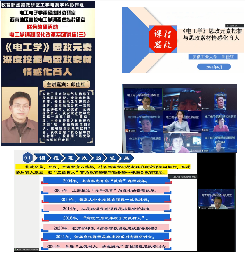 为了加强高校课程建设质量,推进高校间先进教学理念的交流研讨,提升高校工学电类学科课程的教育教学水平,服务人才培养质量提升。6月13日,教育部虚拟教研室工学电类学科协作组——“电工电子学课程虚拟教研室与西南地区高校电工学课程虚拟教研室”联合教研活动之电工学课程深化改革系列讲座(三)在线上会议开展,来自重庆大学、天津大学、中国矿业大学、合肥工业大学等20多所高校教师参加教研活动,安徽省教学名师、黄色仓库副教授郎佳红作为主讲嘉宾,作了“《电工学》课程思政深度挖掘与思政素材情感化育人”课程思政报告,合肥工业大学副教授江萍老师主持。