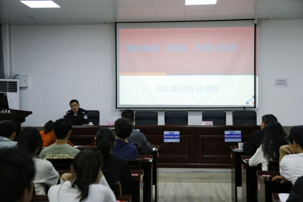 会上,孙朝红以“警校联动——解读大学生防诈密码”为题,结合多年工作经验,以真实案例向参会师生揭示电信诈骗的典型特征与巨大社会危害;针对高校学生群体特点,他重点剖析“购置游戏装备、刷单返利、校园贷陷阱”等校园内高发的电诈类型,并通过还原诈骗分子的话术套路,帮助师生掌握防范的技巧与识别方法,整个报告深入浅出,极大地增强了广大同学们的防诈识诈的敏锐性与行动力。在国家安全教育环节,支部组织委员张悦老师以《隐蔽战线上的青春使命》为题,通过生动案例阐述了维护国家安全的极端重要性,号召广大学生要持续增强国家安全意识,坚定“四个自信”,勇担时代使命。