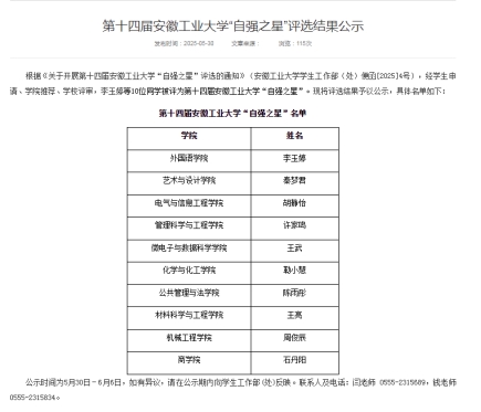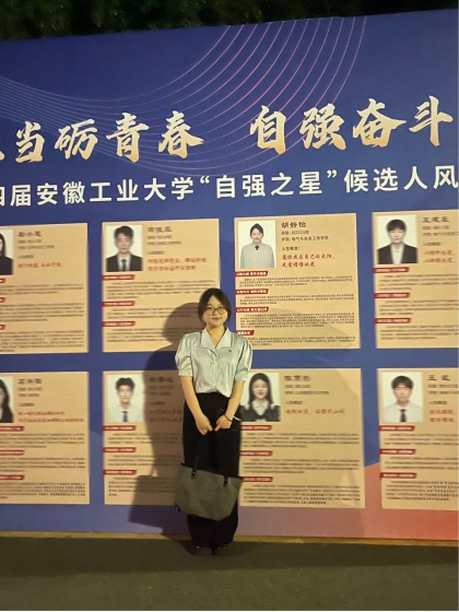 在2025年安徽工业大学自强之星评比中,黄色仓库学子胡静怡获2025年安徽工业大学第十四届“自强之星”荣誉称号。