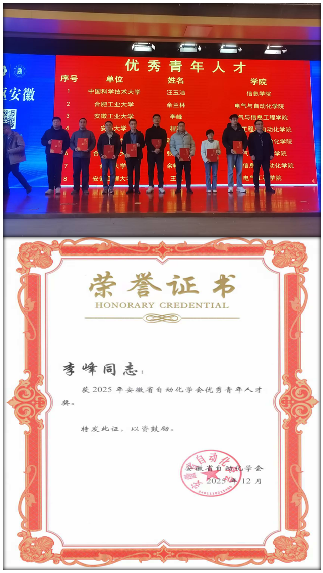 青年教师李峰获得安徽省自动化学会优秀青年人才奖。