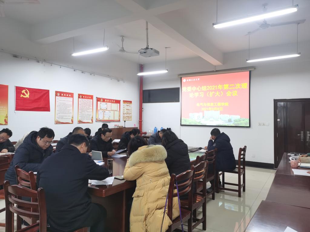 3月8日下午,电气学院党委中心组召开2021年第二次理论学习(扩大)会,学院党政领导、党委委员、党支部书记、系室中心主任、科级干部、工会主席和全体辅导员参加了会议,会议由院党委书记丁忠利主持。