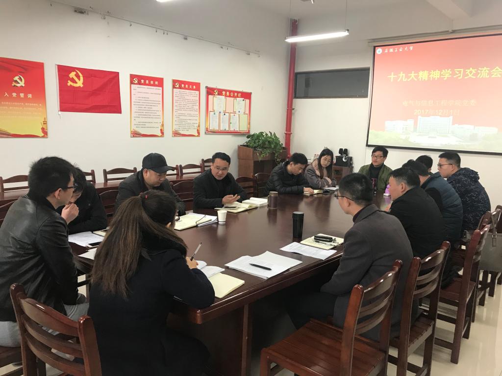 为深入学习党的十九大精神,12月1日上午,电气学院十九大精神交流座谈会在电气楼304举行。学院党委书记叶凤华、党委副书记副院长郭宏,全体辅导员,学生党员代表参与交流座谈。会议由郭宏主持。
