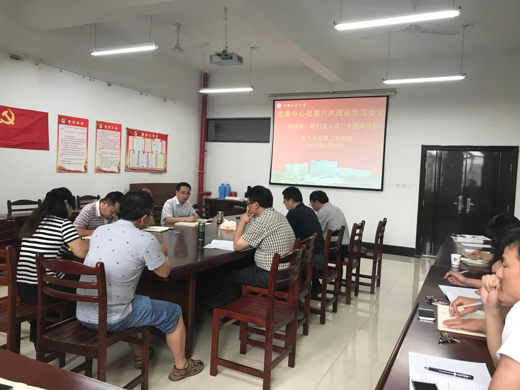 6月28日下午,电气学院党委理论学习中心组召开2017年第六次学习(扩大)会,专题开展“讲重作”第一专题——“讲政治,我们怎么讲”学习研讨。学院领导班子成员、党委委员、党支部书记、科级干部、工会主席、团委书记、各系室中心负责人、全体辅导员、党委秘书参加了会议,会议由院党委书记叶凤华主持。