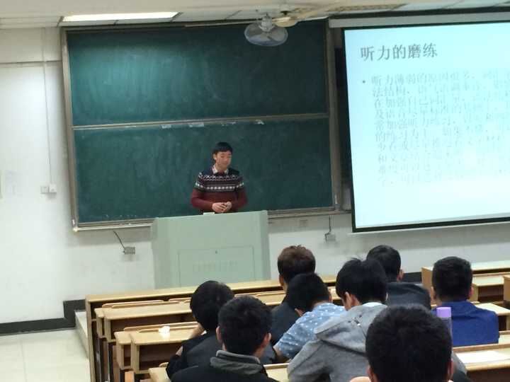 英语四级考试经验交流会教南402召开,学院2013级学生分批次参加会议,学院四级高分党员同学自124班章明明和自123班鲁珍珍向同学们交流了经验。