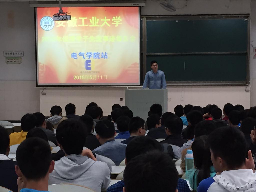 为营造良好的学习氛围,调动大学生学习的热情和积极性,安徽工业大学2015年优秀学子报告会于5月11日下午在阶教102教室顺利举行并圆满结束。学工部副部长胡卫东、电气学院党委副书记、副院长郭宏、团委书记张满堂、辅导员李修正及全体大一学生参加本次报告会,胡卫东主持了本次会议。