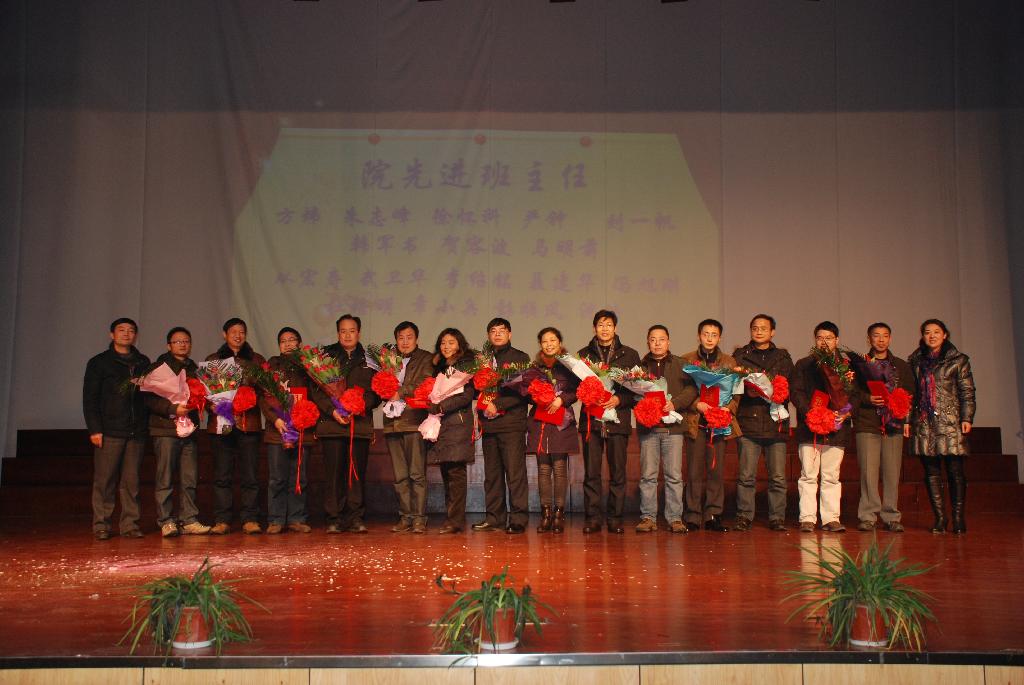 文艺演出后,表彰大会在雄壮的国歌声中拉开帷幕, 电气信息学院院长刘晓东通报了2011—2012学年评奖、评优情况,副院长郭宏通报了2011—2012学年17位先进班主任名单,副院长聂建华通报了学院2011—2012学年科技竞赛获奖同学名单,副院长章家岩通报了学院2011—2012学年35位结对帮扶先进个人名单。优秀班主任代表朱志峰老师、先进班集体代表陈盼盼、先进个人代表许泽恩两位同学分别发言。