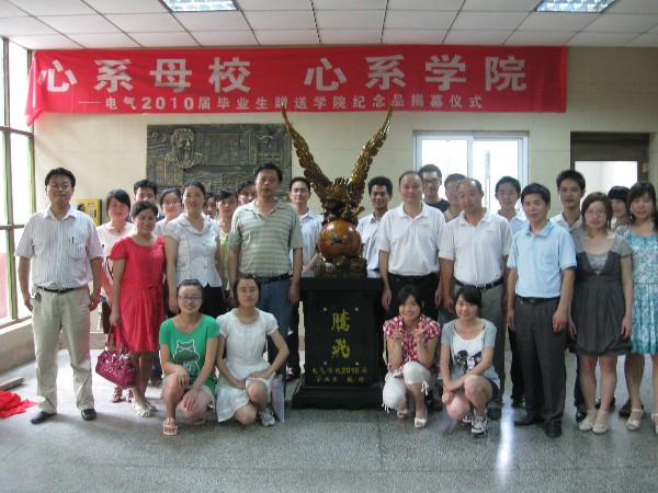 2010届全体毕业生赠送学院一座以雄鹰和地球仪为题材的雕塑,雕塑以“腾飞”为主题,展翅的雄鹰怀中有一个地球仪,雕塑底座背面的四句话“心系母校,胸怀祖国,放眼世界,大展宏图”表明了寓意,同时也表达了毕业生对母校的美好祝福,祝福母校明天更加辉煌。