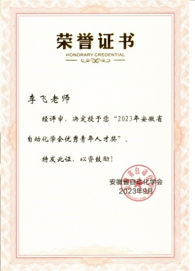 李飞老师被授予2023安徽省自动化学会优秀青年人才奖。