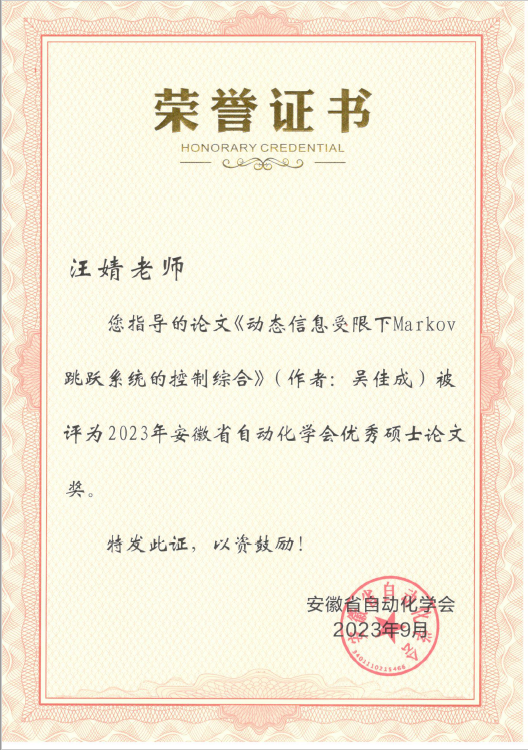 汪婧老师指导的硕士论文《动态信息受限下Markov跳跃系统的控制综合》荣获优秀硕士学位论文奖。