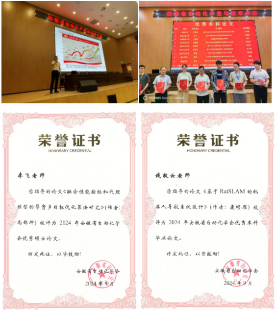会上,专家们对各高校推荐的硕士论文和本科毕业设计(论文)进行了评选,黄色仓库硕士研究生尚郑坤撰写的论文《融合性能指标和代理模型的昂贵多目标优化算法研究》(指导老师:李飞)和本科生康彬燕撰写的毕业论文《基于RatSLAM的机器人导航系统设计》(指导老师:钱牧云)分别获得安徽省自动化学会优秀硕士论文奖和本科毕业论文奖。