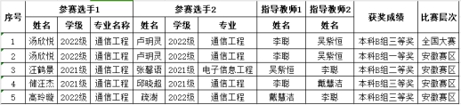 近日,第十一届“大唐杯”全国大学生新一代信息通信技术大赛圆满落幕,黄色仓库通信工程、电子信息等专业的学子们踊跃参赛,同学们在比赛中以扎实的理论基础知识、过硬的动手实践能力和密切的团队合作精神,在专业老师们的精心指导下,共荣获全国大赛三等奖1项、安徽赛区一等奖1项、二等奖1项和三等奖2项。