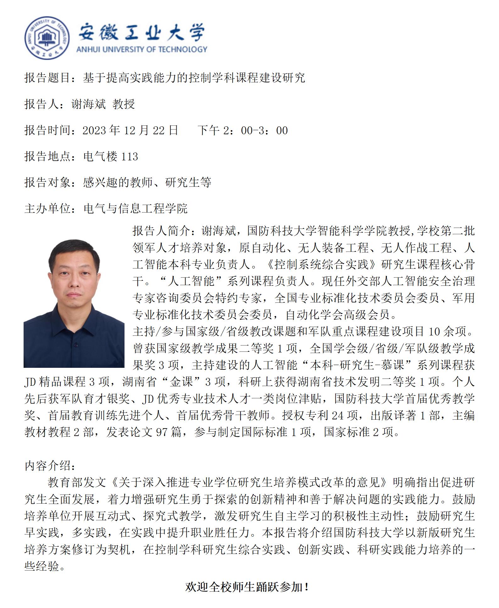 “谦之”学术讲坛之六十五-基于提高实践能力的控制学科课程建设研究