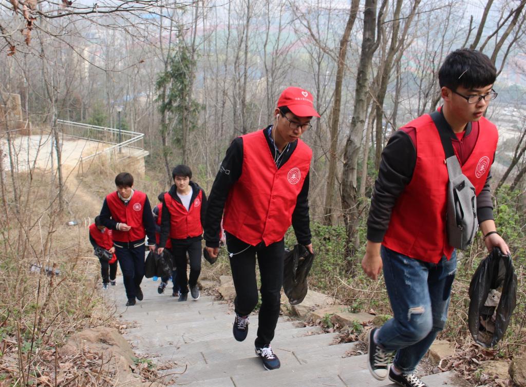 早上8:10,同学们就带着劳动工具来到霍里山,干劲十足地开始为这片美丽的山林做清洁。同学们一路沿着阶梯上山,将路上的塑料瓶、废纸屑、瓜子皮等拾起,大家不怕脏不怕累地把它们放到垃圾袋里。随着同学们越来越接近山顶,手中的垃圾袋也越来越满,登临绝顶,每个人都汗流浃背,但是看着脚下干净的路,葱郁的山林,一切的疲惫在山顶美丽的风光下都消失无踪。