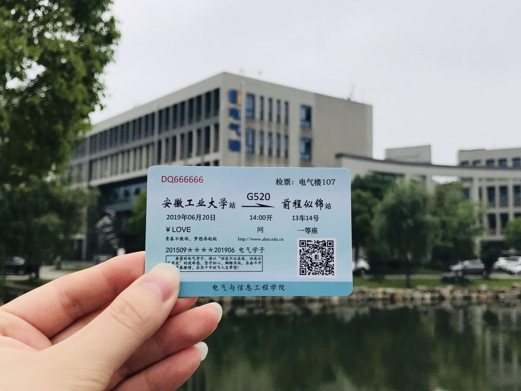 从安徽工业大学站出发,乘坐“复兴号”G520次时光列车,驶向前程似锦站,票价为永恒的爱,检票口设在电气楼学工办。每位毕业生都领取到这样一张别出心裁的“车票”,意味着他们即将告别一段旧的时光,开启一段新的旅程。