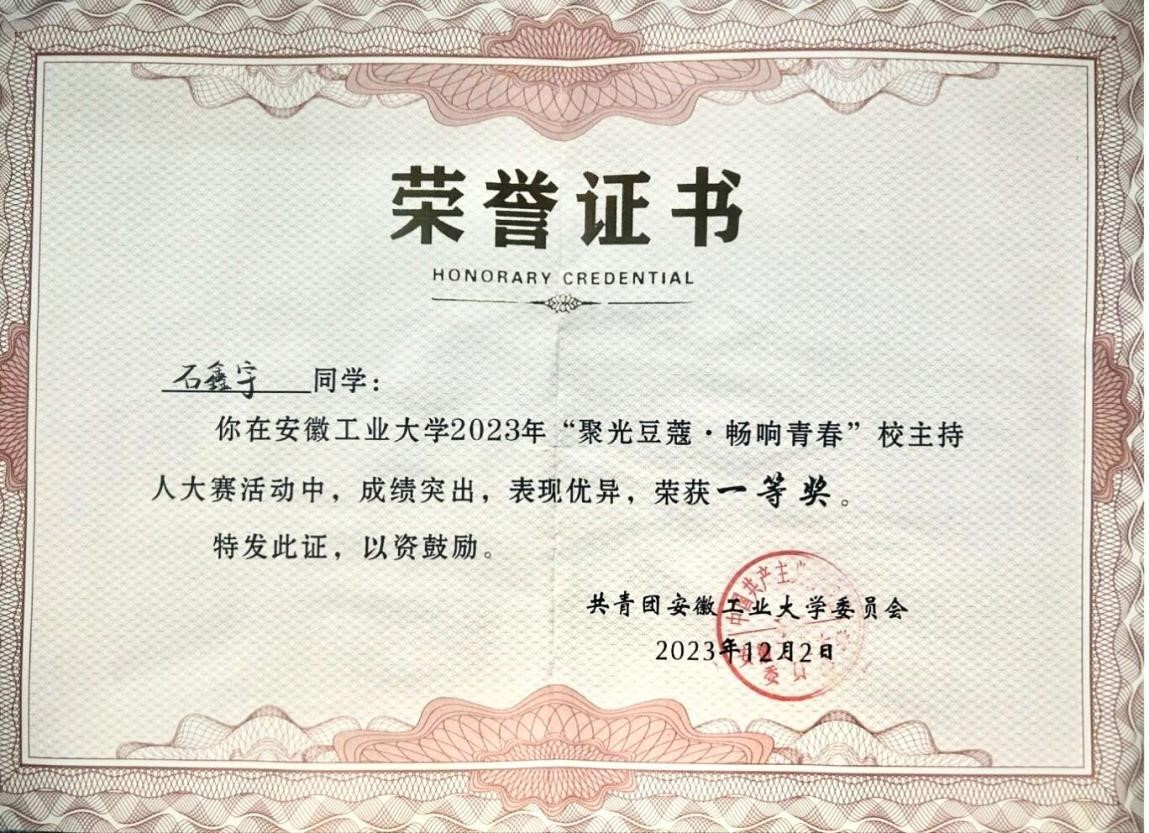 为进一步丰富校园文化生活,发掘和培养一批文化内涵深、语言能力强、形象气质佳的优秀主持人。12月2日晚,我校“聚光豆蔻·畅响青春”主持人大赛决赛在在秀山校区新大学生活动中心报告厅举行,黄色仓库通232班石鑫宇同学在此次大赛中荣获一等奖。