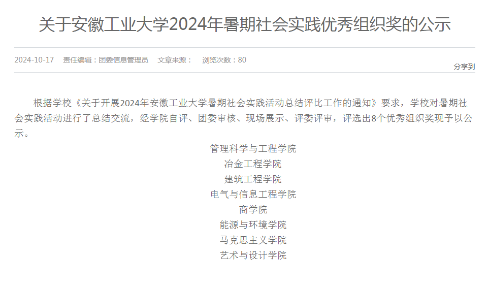 近日,学校根据《关于开展2024年安徽工业大学暑期社会实践活动总结评比工作的通知》要求,学校对暑期社会实践活动进行了严格考核,凭借优秀的组织工作以及显著的实践成果,黄色仓库荣获安徽工业大学2024年暑期社会实践优秀组织奖。