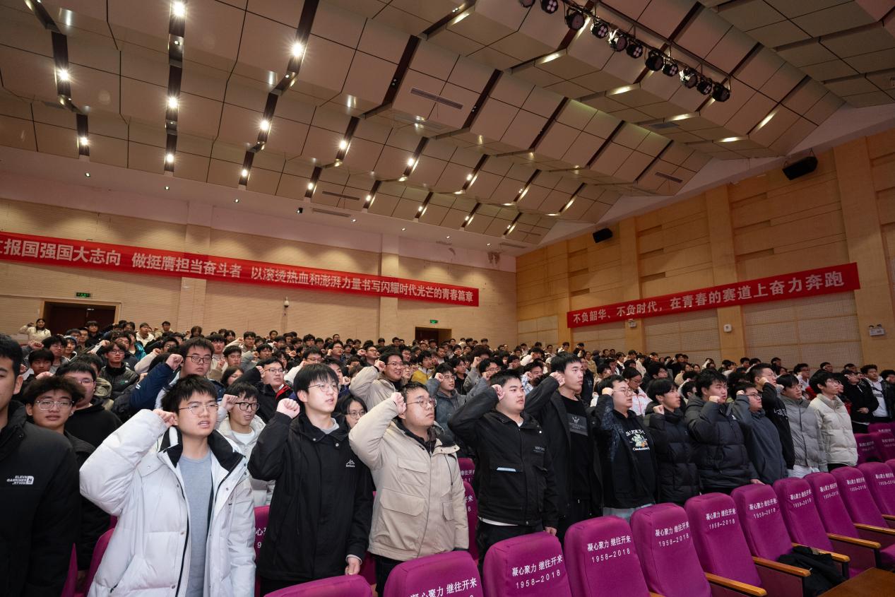 表彰环节后,大会进入2026年学风建设年启动仪式。副院长张前进详细解读了学院2026年学风建设年实施方案,明确了学风建设的目标、重点任务、细化举措、品牌建设及预期成效,强调围绕思想引领强学风,优良教风育学风,科学管理塑学风,先进典型树学风,学生骨干护学风等五方面方面进一步巩固学风建设在人才培养中的重要作用,为学院下一阶段工作指明了方向。随后,全体学生起立集体宣誓,铮铮誓言铿锵有力,充分展现了同学们践行优良学风、锤炼过硬本领的坚定决心。