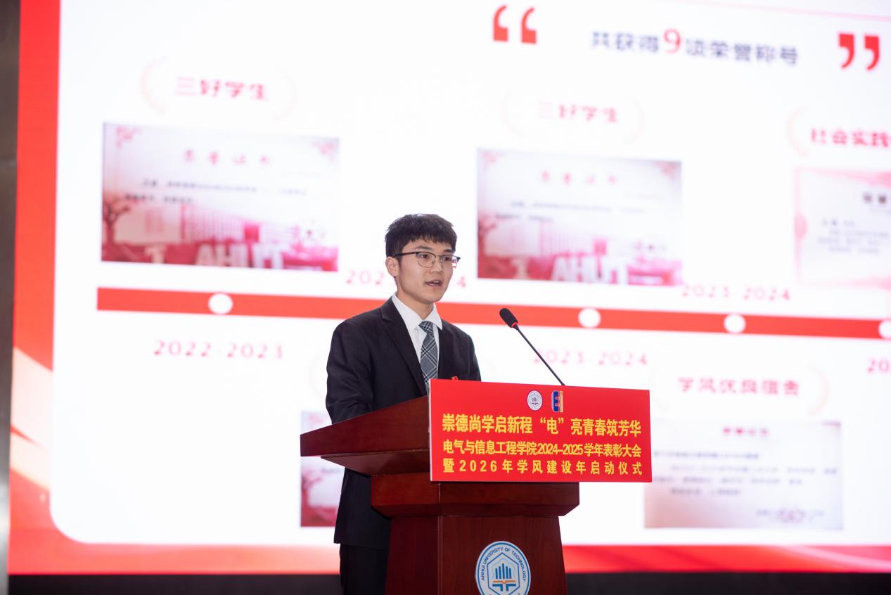 与会人员共同欣赏了暖场歌曲《辞家千里又千里》,观看了学院团委2025年度总结纪录片《“电”亮》,记录片回顾一年来电气团学活动的丰硕成果与电气学子昂扬向上的精神面貌。第二十八届学生会主席、国家奖学金获得者王毅,宝钢奖学金获得者郭策、两项A类科技赛事国家级一等奖获得者张逸帆、体育赛事获奖代表李泽聪、梁警文、邓璇、廖晖,校十佳班级自224班学生代表自224班柳欢、侯云飞分别围绕“砺学笃行之光”、“科创领航之光”、“才体双馨之光”、“凝心聚力之光”四个主题,通过讲述、访谈、朗诵的形式生动展现了电气学子勤学笃行、团结拼搏、勇攀高峰的青春风貌。